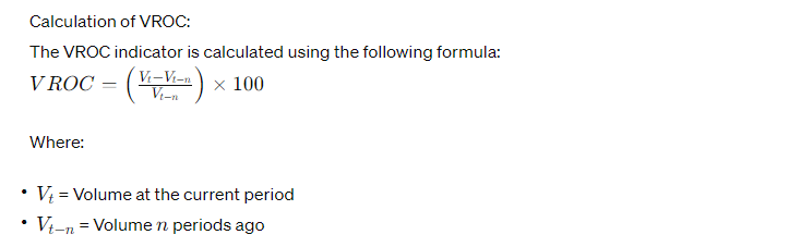 The Volume Rate of Change (VROC) indicator, also known as Volume ROC, is a momentum oscillator that measures the rate of change in volume over a specified period. It is designed to provide traders with insights into the strength or weakness of price movements based on changes in trading volume.